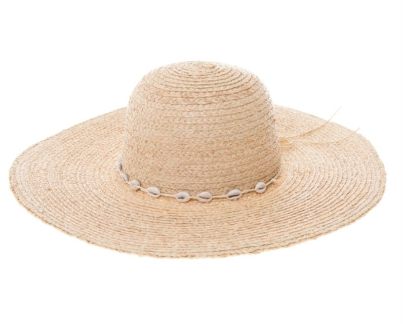 Perfect beach hat in raffia straw with a simple trim of white cowrie shells.
