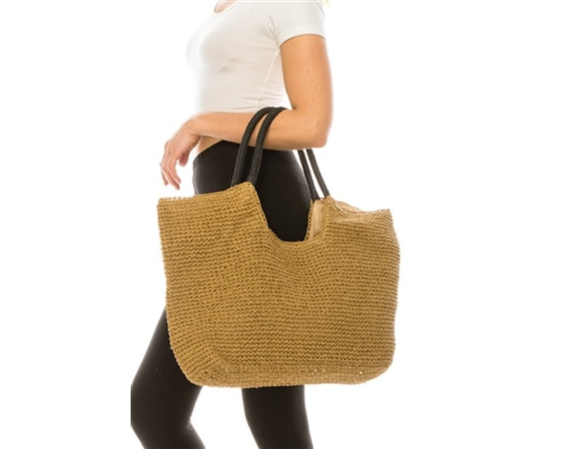 Hand crocheted toyo straw beach bag with wrapped straw handles.